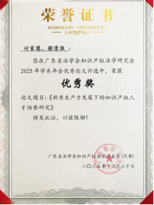 在广东省法学会知识产权法学研究会2025年学术年会优秀论文评选中,付家慧、谢淯淮同学撰写的论文《新质生产力发展下的知识产权人才培养研究》荣获优秀奖。该论文立足新质生产力发展背景,探讨了知识产权人才培养的创新路径,得到了评审专家的高度认可。